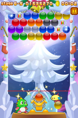 Si vous ne connaissez pas Bust-a-move (vous devez sûrement connaître un de ses clones), le principe est simple. Le haut de l’écran est rempli de bulles colorées. En bas, votre canon qui tire une bulle à la fois. Il suffit d’assembler trois bulles de la même couleur pour les faire disparaître. Au fur et à mesure, les autres bulles descendent. Si elle dépassent le ligne rouge, c’est perdu.