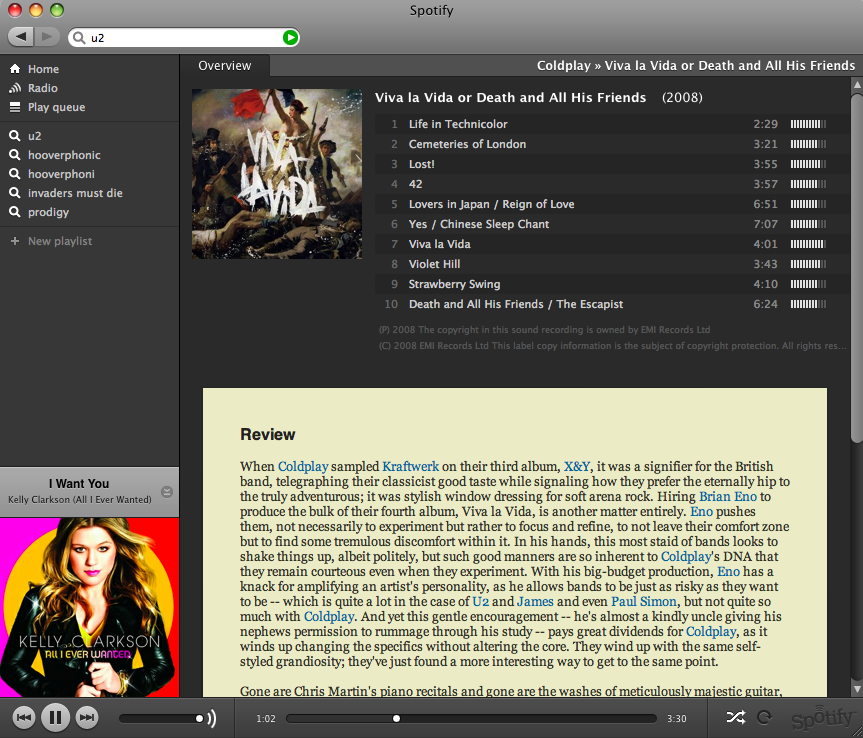 C’est là qu’arrive Spotify. Contrairement à Deezer qui est uniquement basé sur le site, donc contraint au navigateur, Spotify est une application de bureau, disponible actuellement pour Windows et Mac. L’interface ressemble fortement à iTunes, ce qui n’est pas plus mal, pour ne pas dérouter les nouveaux utilisateurs. La richesse du catalogue est assez impressionnante, ce dernier s’enrichissant au fil du temps.